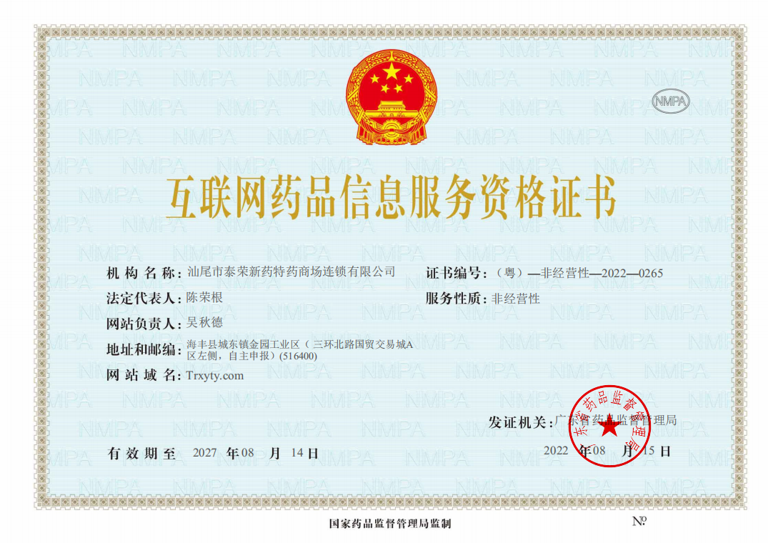 互聯(lián)網(wǎng)藥品信息服務資格證書 :(粵)一非經(jīng)營性- -2022- -0265