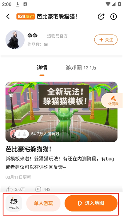 5、了解派對地圖的作者是誰,還能看到這個(gè)地圖有多少人游玩過等等信息,在游玩上支持多種模式一起玩、單人游玩、直接游玩等。