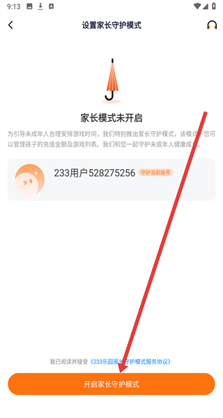 4、在進(jìn)入到設(shè)置家長守護(hù)模式頁面,可以點(diǎn)擊下方開啟按鈕,完成家長模式設(shè)置。