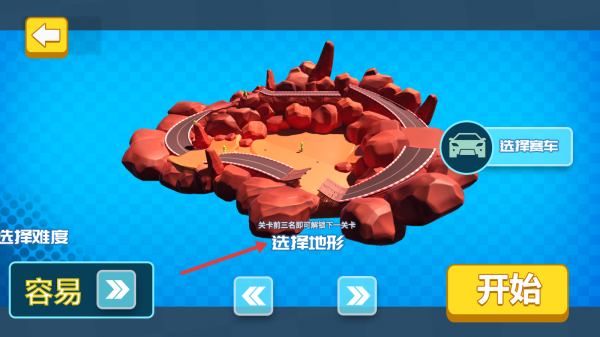2、選擇難度(如【容易】),點(diǎn)擊【選擇地形】確定賽道,再選賽車,點(diǎn)【開始】開啟比賽。