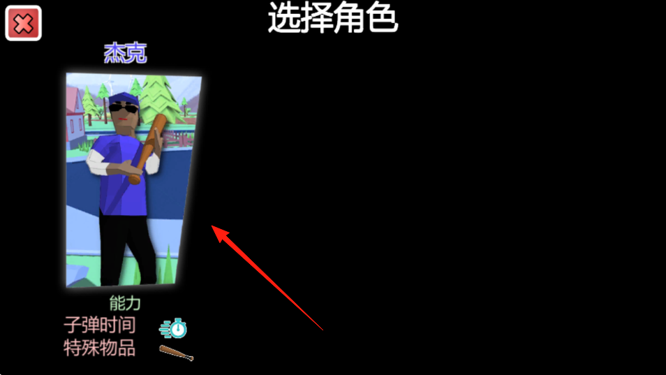 1、進(jìn)入游戲后,先選擇杰克角色箭頭指向,其子彈時(shí)間能力和棒球棍特殊物品,可助你戰(zhàn)斗。