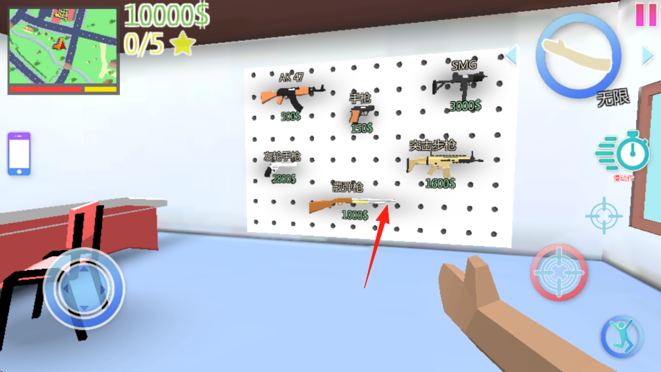 2、進(jìn)入武器室,點(diǎn)擊箭頭指向的散彈槍,花費(fèi)1000$購買,裝備強(qiáng)力武器。