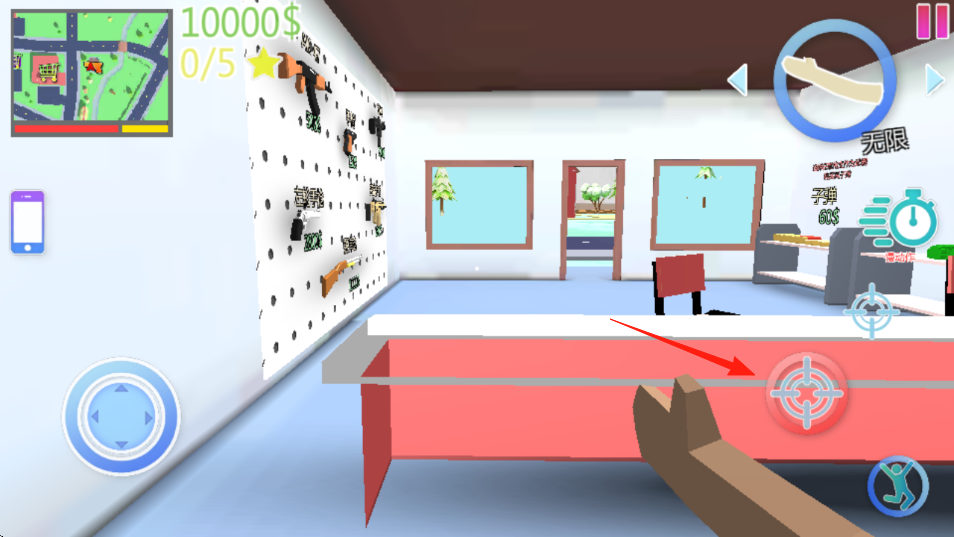 3、靠近桌子,點(diǎn)擊箭頭指向的瞄準(zhǔn)按鈕,進(jìn)入戰(zhàn)斗狀態(tài),利用武器和技能,應(yīng)對(duì)城市冒險(xiǎn)中的挑戰(zhàn)。