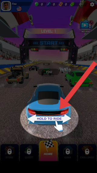 1、目前處于賽前準(zhǔn)備的場景,玩家可點(diǎn)擊HOLD-TO-RIDE方可進(jìn)入場景,畫面中還有其余不同類型的賽車。
