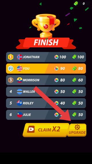 3、顯示本場比賽已結(jié)束,玩家排名在第二位,獲得錢幣獎勵(lì)+80,可點(diǎn)擊UPGRADE進(jìn)行下一場比賽。