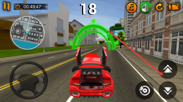 1、開局在城市的道路上,按右側(cè)的加速鍵起步,用方向盤控制方向,瞄準(zhǔn)綠色的導(dǎo)航拱門行駛。
