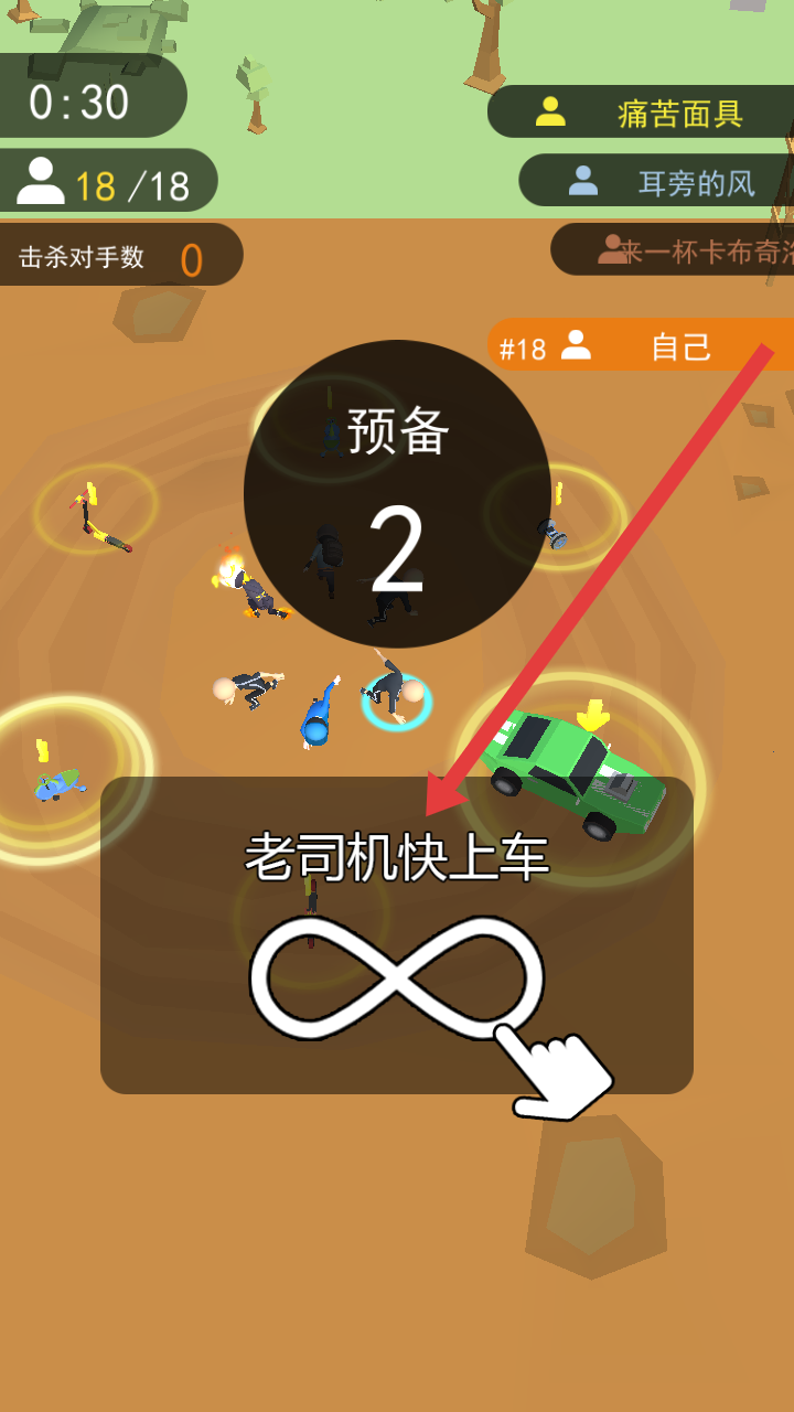 1、進(jìn)入開局的階段,需要點(diǎn)擊老司機(jī)快上車提示,駕駛車輛加入18人的對戰(zhàn),開啟競技冒險。
