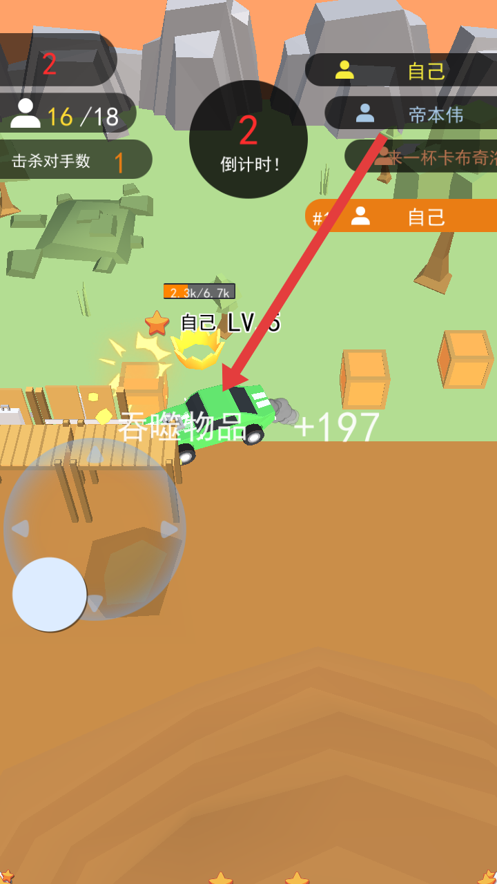 2、在游戲中操控自己的車輛移動,吞噬場景內(nèi)物品,積累成長值提升等級如LV.6,增強(qiáng)對戰(zhàn)的能力。