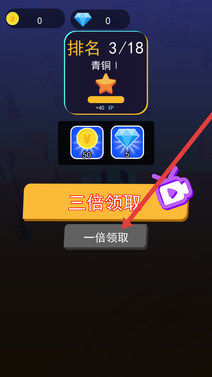 3、在對局結(jié)束后,需要點(diǎn)擊一倍領(lǐng)取的按鈕,獲取金幣、鉆石及XP獎勵,也可以選擇觀看廣告。