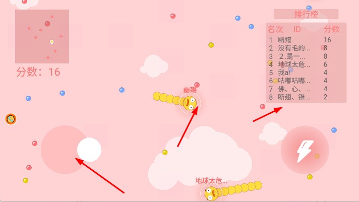 3、進入場景,通過滑動屏幕,操控貪吃蛇移動,吃彩色小球讓蛇變長,同時避開其他玩家的蛇,在多人匹配競技中,存活到最后即可獲勝。