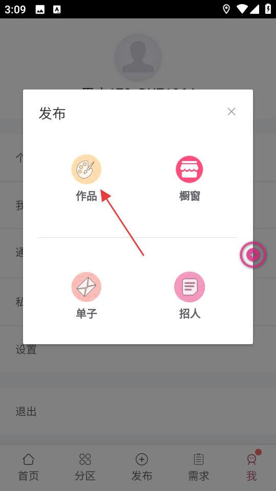 1、在我的頁面點擊發(fā)布按鈕后,會彈出發(fā)布選項框,有作品,櫥窗,單子,招人這幾個選項,你選擇作品,就能進入發(fā)布作品的流程,把自己的創(chuàng)作分享出來,和大家交流。