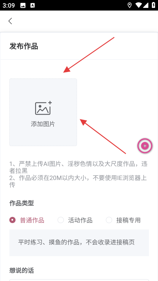 2、進入發(fā)布作品頁面后,你可以點擊添加圖片,選擇要發(fā)布的作品圖片,頁面還標注了上傳規(guī)則,比如不能傳AI圖片等違規(guī)內(nèi)容,作品大小也要在20M以內(nèi)。