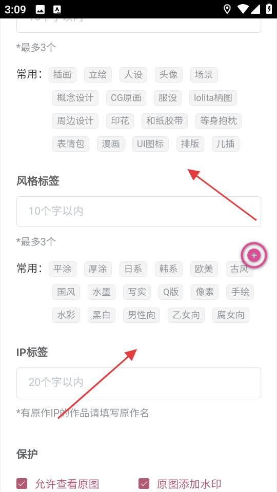 3、發(fā)布作品時,你可以給作品添加標簽,有常用標簽最多能選3個,要是作品有原作IP,還能填寫IP標簽,另外在保護選項里,你可以選擇是否允許查看原圖。