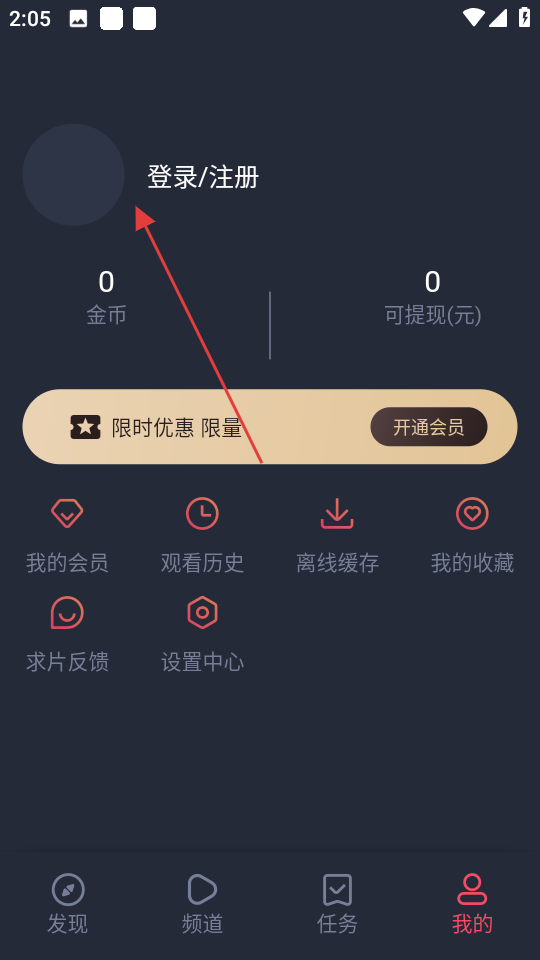 2、進(jìn)入我的頁面后,點(diǎn)擊登錄注冊(cè)進(jìn)行操作。