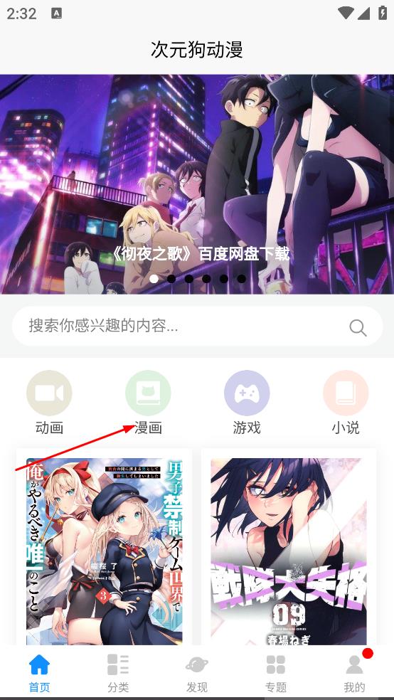 1、在次元狗動(dòng)漫首頁,點(diǎn)擊漫畫,進(jìn)入漫畫頁面。
