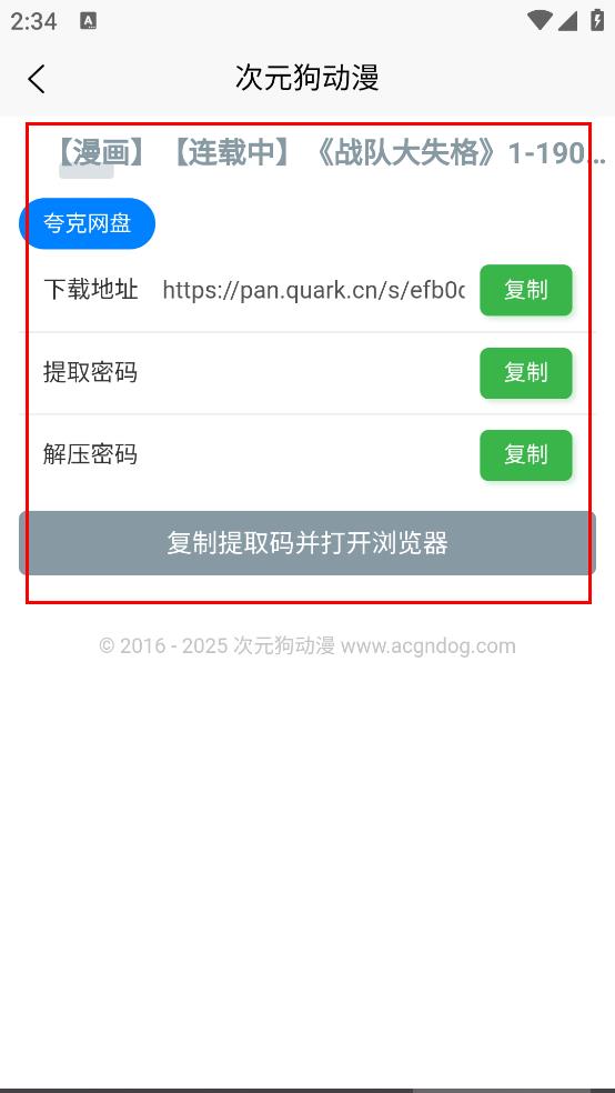 4、在下載信息頁面,可查看漫畫的下載地址、提取密碼、解壓密碼等,進(jìn)行復(fù)制等操作。
