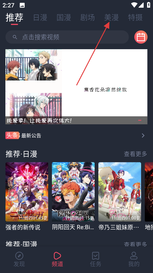 1、打動漫共和國,在頂部導(dǎo)航欄點擊美漫。