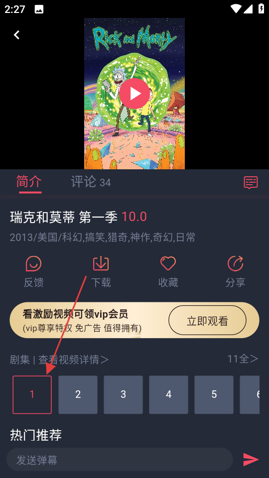 4、進入瑞克和莫蒂第一季詳情頁后,點擊1即可觀看第一集。