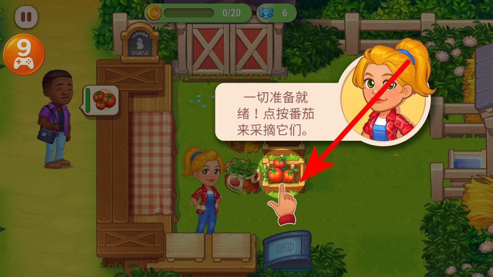 1、進(jìn)入關(guān)卡后,按照提示,點(diǎn)按成熟的作物,比如番茄,完成采摘操作,采摘后的作物會(huì)準(zhǔn)備好用于后續(xù)步驟。