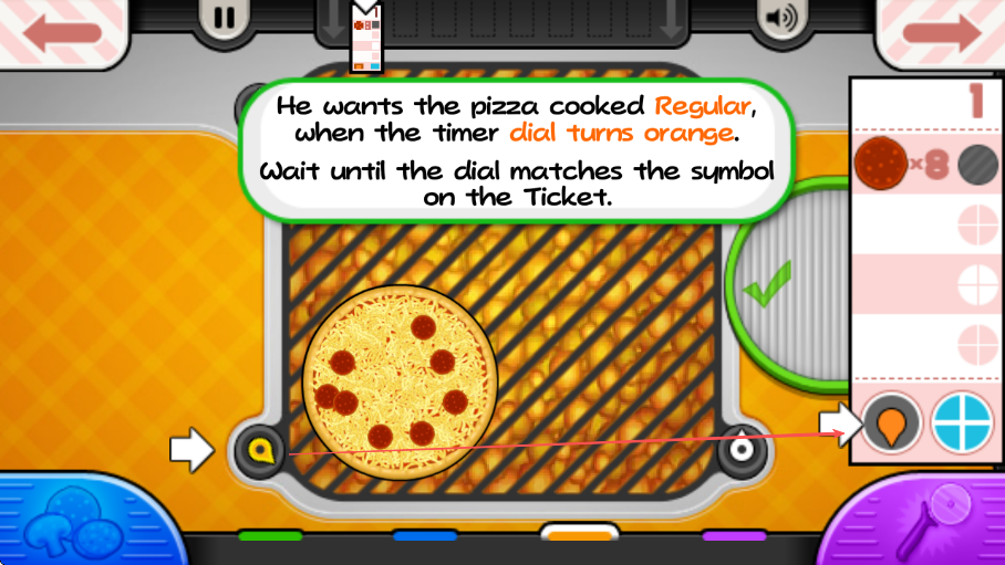 1、查看提示信息,按要求將披薩放入烤爐,留意烤爐定時(shí)器,當(dāng)timerdial變成橙色時(shí),披薩達(dá)到Regular烤制程度。