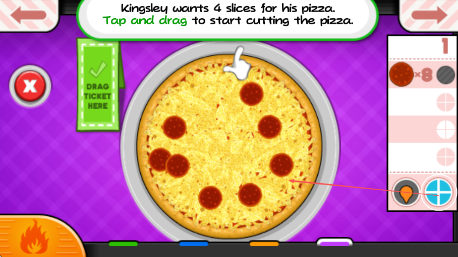 2、烤制完成后取出披薩,看到提示Kingsley wants 4 slices for his pizza,點(diǎn)擊并拖動(dòng)開始將披薩切成4塊。
