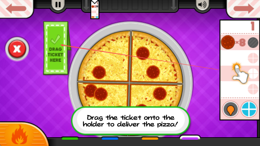3、切好披薩后,根據(jù)提示Drag the ticket onto the holder to deliver the pizza!,把訂單票拖到指定位置完成披薩交付。