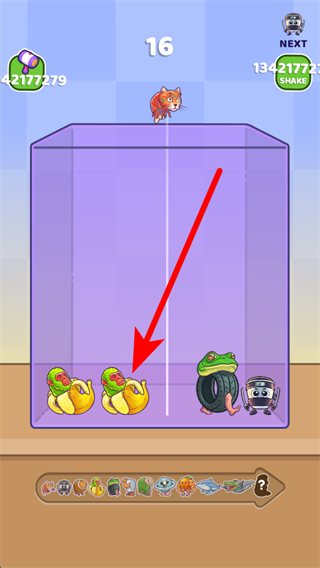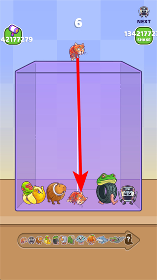 1、游戲界面會(huì)有不同動(dòng)物從上方掉落,玩家可左右移動(dòng)動(dòng)物,調(diào)整其掉落位置,將動(dòng)物放入下方的紫色容器中。