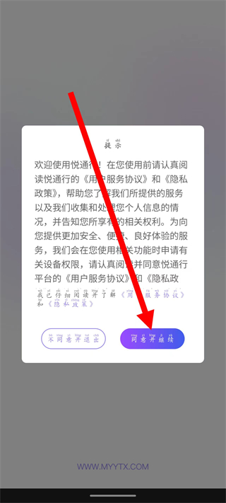 1、打開悅通行,在提示彈窗中點擊同意并繼續(xù),確認閱讀并同意。