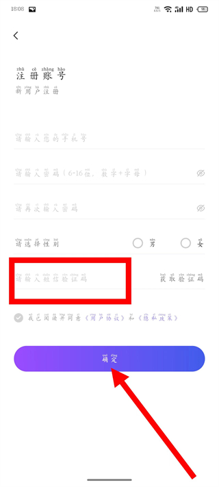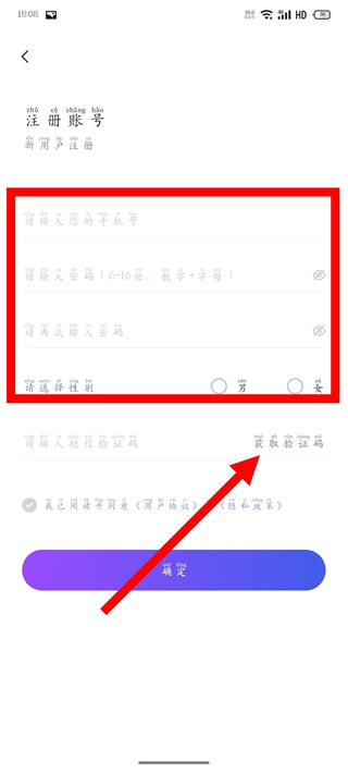 3、輸入手機號、設(shè)置6-16位含數(shù)字和字母的密碼,選擇性別,點擊獲取驗證碼。