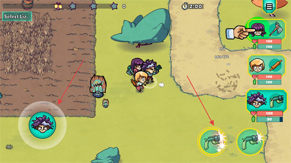 2、通過(guò)左下角帶有角色頭像的輪盤控制相應(yīng)角色移動(dòng),右下角的技能鍵是否角色攻擊。