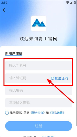 3、在新用戶(hù)注冊(cè)頁(yè)面,輸入手機(jī)號(hào),點(diǎn)擊獲取驗(yàn)證碼并輸入。