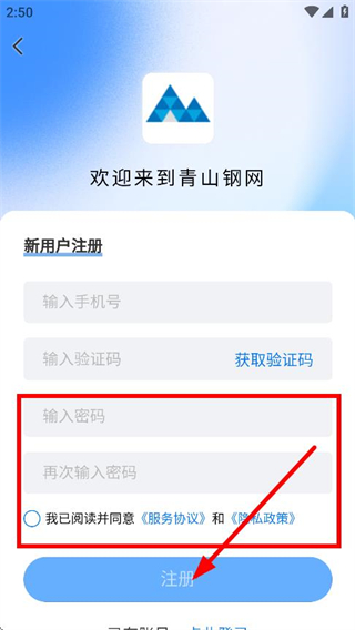 4、在輸入密碼、再次輸入密碼并勾選同意后點(diǎn)擊注冊(cè),完成賬號(hào)注冊(cè)操作。