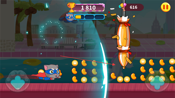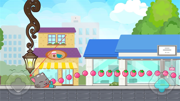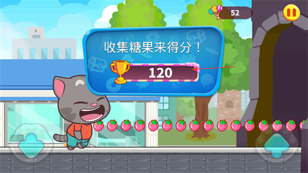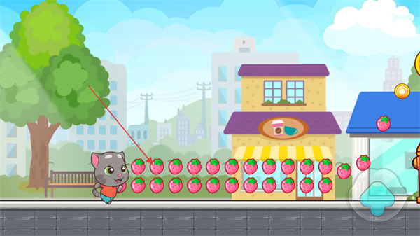 1、操控湯姆貓在城市街道中奔跑,收集沿途的草莓、糖果等道具,積累得分。