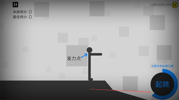 1、選擇游戲模式如普通模式進(jìn)入游戲,長按起跳按鈕控制起跳力度,找準(zhǔn)發(fā)力點(diǎn)讓火柴人起跳。